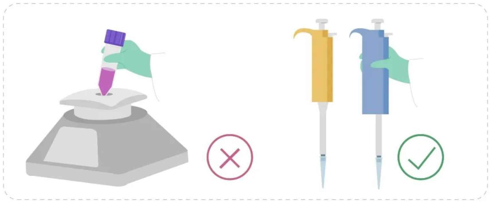 正确操作:移液器枪头轻轻吹打混匀或者上下颠倒混匀。若无法做到充分溶解,可以将复溶产品至于水平摇床低速摇一段时间或 4℃ 静置 2 h 以上。