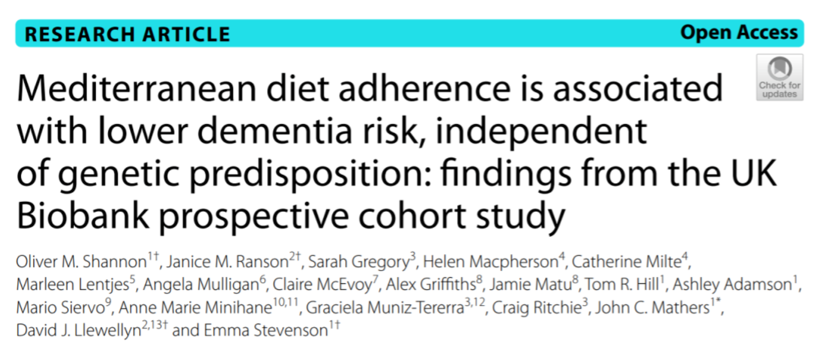 2023年3月14日,英国纽卡斯尔大学和埃克塞特大学的研究人员在 BMC Medicine 期刊发表了题为: Mediterranean diet adherence is associated with lower dementia risk, independent of genetic predisposition: fndings from the UK Biobank prospective cohort study 的研究论文。