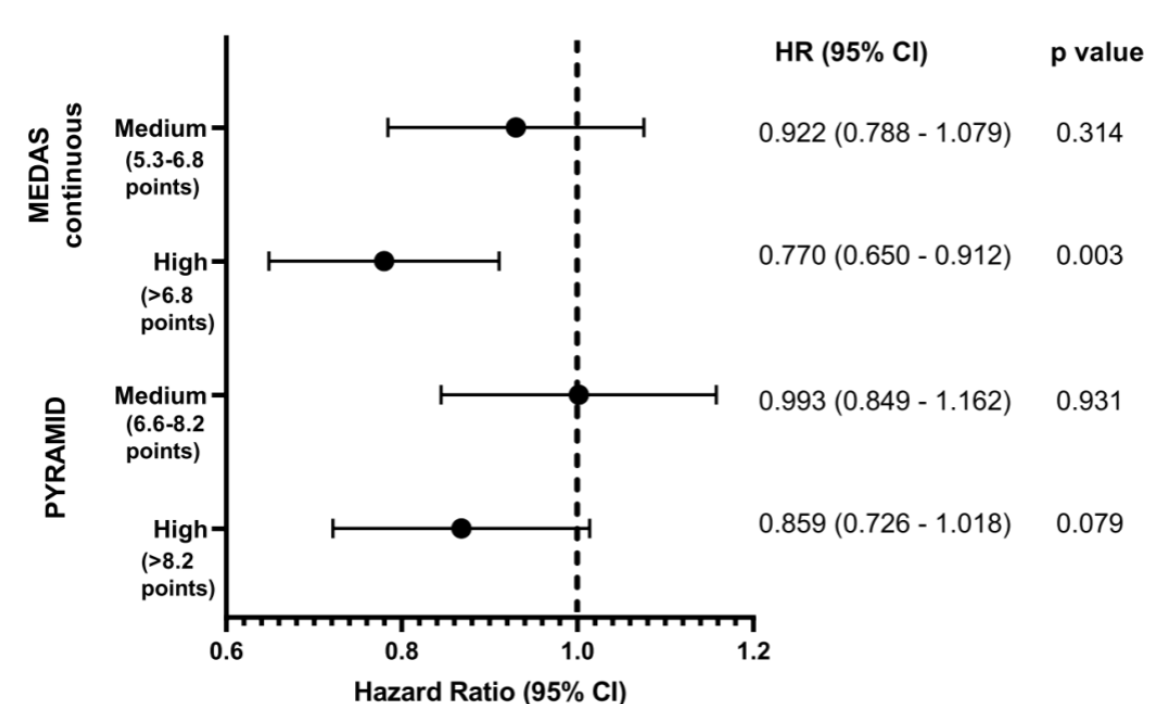 着这项研究中,研究团队分析了英国生物样本库 (UK Biobank) 中60298个个体的数据,这些人都完成了饮食评估。研究团队用了两个衡量标准评估了他们对地中海式饮食的依从程度。在平均9.1年的随访中,出现了882例痴呆症患者。研究团队也将每个个体的痴呆症遗传风险考虑了进来,评估了他们的多基因风险——这种方法会评估与痴呆症风险相关的多个基因。