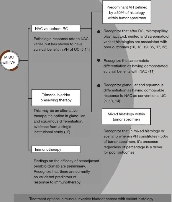 具有不同组织学的肌肉浸润性膀胱癌的治疗选择。MIBC,肌肉浸润性膀胱癌;VH,变异组织学;NAC,新辅助化疗;RC,根治性膀胱切除术;UC,尿路上皮癌。