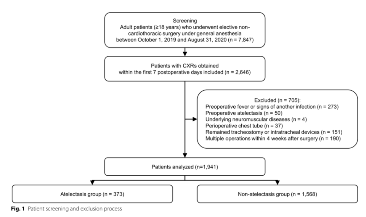 方法:本研究回顾了2019年10月至2020年8月期间在全身麻醉下接受择期非心胸手术的成人患者的电子病历。他们被分成两组:一组术后出现肺不张(肺不张组),另一组没有发生肺不张(非肺不张组)。主要观察指标是术后30天内肺炎的发生率。次要观察指标为ICU转入率和停留时间。