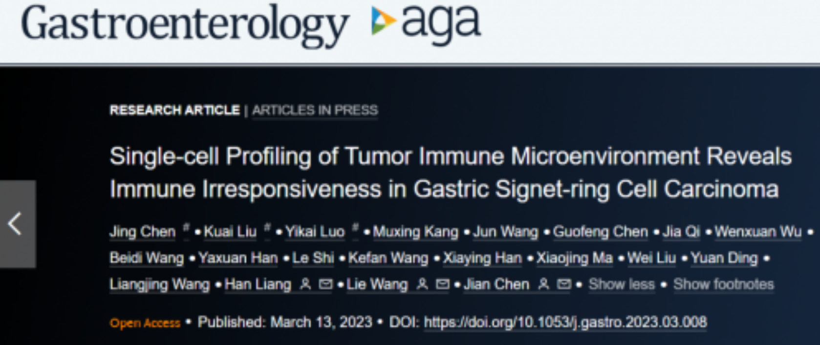 2023年3月13日,浙江大学陈健,汪洌及德克萨斯大学MD安德森癌症中心Liang Han共同通讯在Gastroenterology(IF=34)在线发表题为“Single-cell Profiling of Tumor Immune Microenvironment Reveals Immune Irresponsiveness in Gastric Signet-ring Cell Carcinoma”的研究论文,该研究提供了晚期GC患者免疫细胞组成和细胞状态的全面分子画像,强调了GSRCC中的适应性免疫无反应性以及CXCL13在TIME中的中介作用。该研究的单细胞转录组和蛋白质组分析代表了一个强大的方法,以时间为导向的临床转化研究。