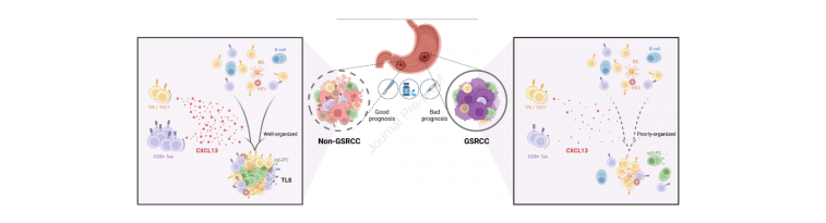 多组学分析已经从原发和/或转移部位捕获了肿瘤细胞的内在特征。然而,肿瘤免疫微环境(TIME)是影响癌症发生、进展和预后的关键因素,其特征仍不明确。推测TIME的异质性主要来源于肿瘤的异质性,进而影响癌细胞的行为和临床结果。因此,该研究决定探索GSRCC是否具有独特的TIME情况,以及其TIME特征如何导致预后不良。该研究招募了32例不同亚型的晚期胃癌患者,并使用免疫靶向单细胞分析策略分析了他们的TIME,包括(i)免疫靶向单细胞RNA测序(scRNA-seq, n = 20例患者)和(ii)通过靶向抗体组进行大规模细胞术的蛋白表达分析(CyTOF, n = 12例患者)。该研究发现,与非GSRCC相比,GSRCC TIME似乎处于静止状态,CD4+ 和CD8+ T细胞都难以被动员,这进一步损害了B细胞的正常功能。CXCL13主要由Tfh、Th17和耗竭的CD8+ T细胞产生,是这种转化的中心协调器。该研究发现CXCL13的表达可以预测GC患者对免疫检查点阻断的反应,这可能与其对三级淋巴结构的影响有关。该研究提供了晚期GC患者免疫细胞组成和细胞状态的全面分子画像,强调了GSRCC中的适应性免疫无反应性以及CXCL13在TIME中的中介作用。该研究的单细胞转录组和蛋白质组分析代表了一个强大的方法,以时间为导向的临床转化研究。