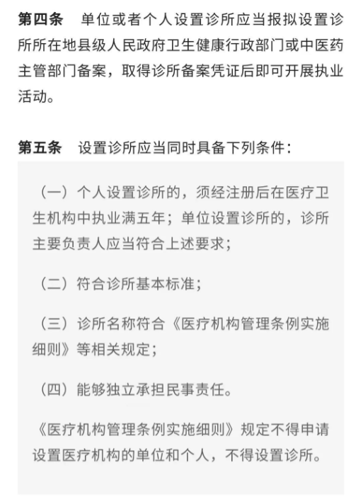 《通知》第二章第五条表示,个人设置诊所的,须经注册后在医疗卫生机构中执业满五年;单位设置诊所的,诊所主要负责人应当符合上述要求。