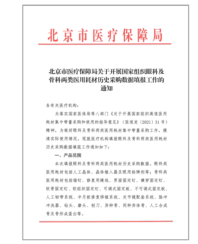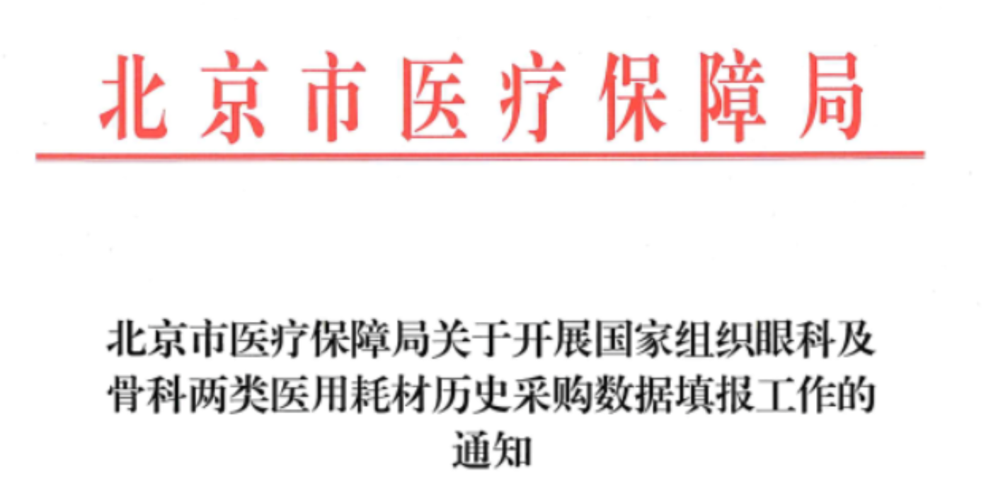 今日(3月16日),北京市医保局公开发布了《北京市医疗保障局关于开展国家组织眼科及骨科两类医用耗材历史采购数据填报工作的通知》。