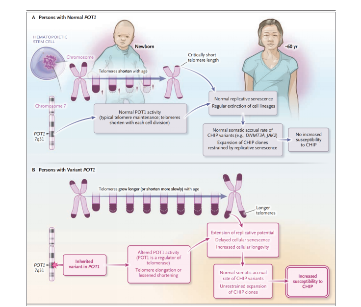 图1:POT1、端粒⻓度和CHIP的关联。来源:nejm.org