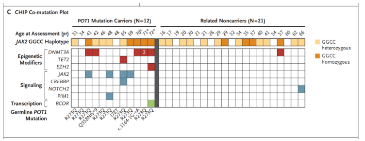 图3:CHIP突变图,对比POT1突变携带者及其非携带者的亲属。顶端数字显示个体年龄分类。来源:nejm.org
