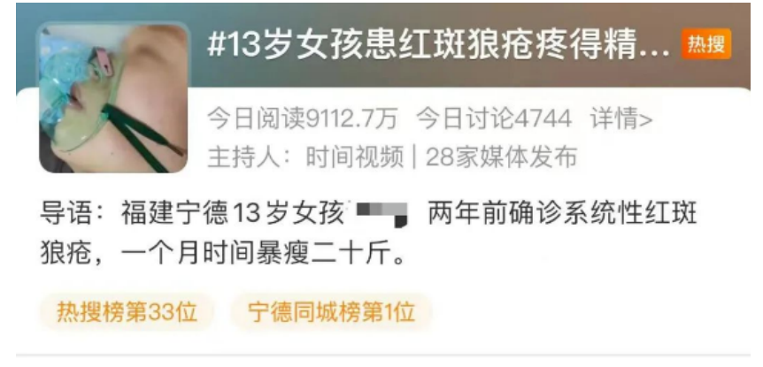 前不久,#13岁女孩患红斑狼疮疼的精神异常#登上微博热搜!